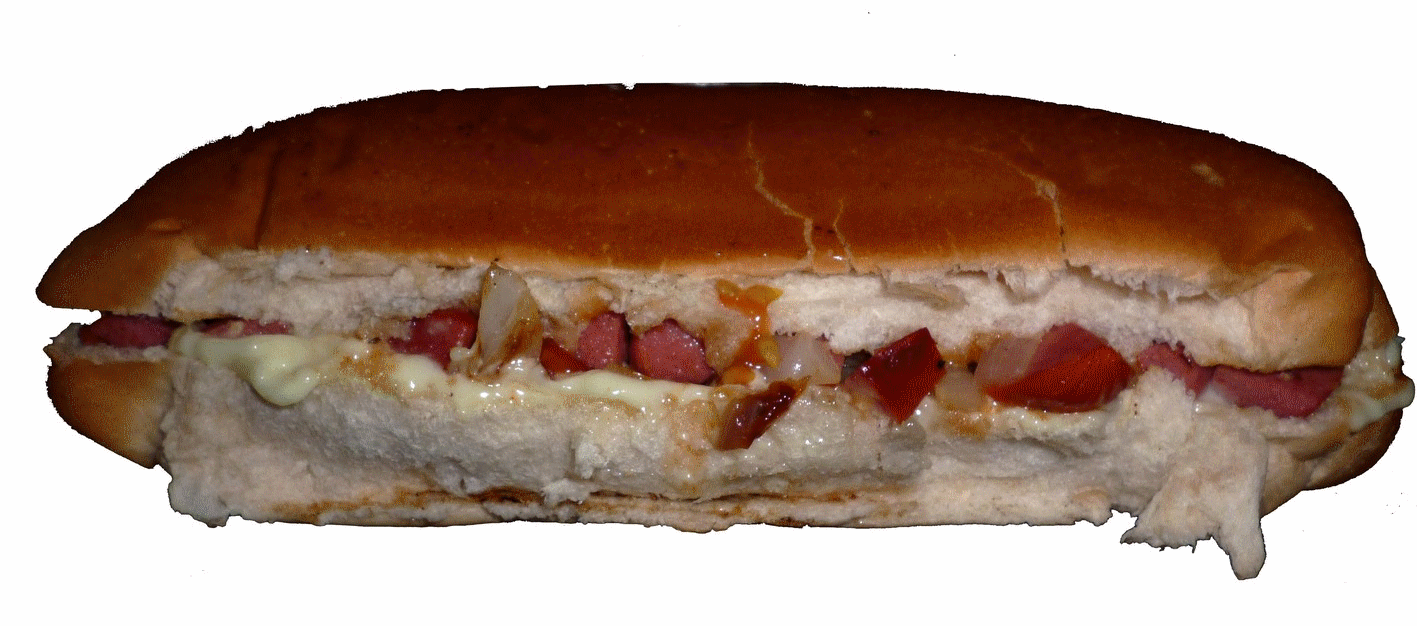 Pão de dog, carne, cebola, repolho, tomate e maionese.